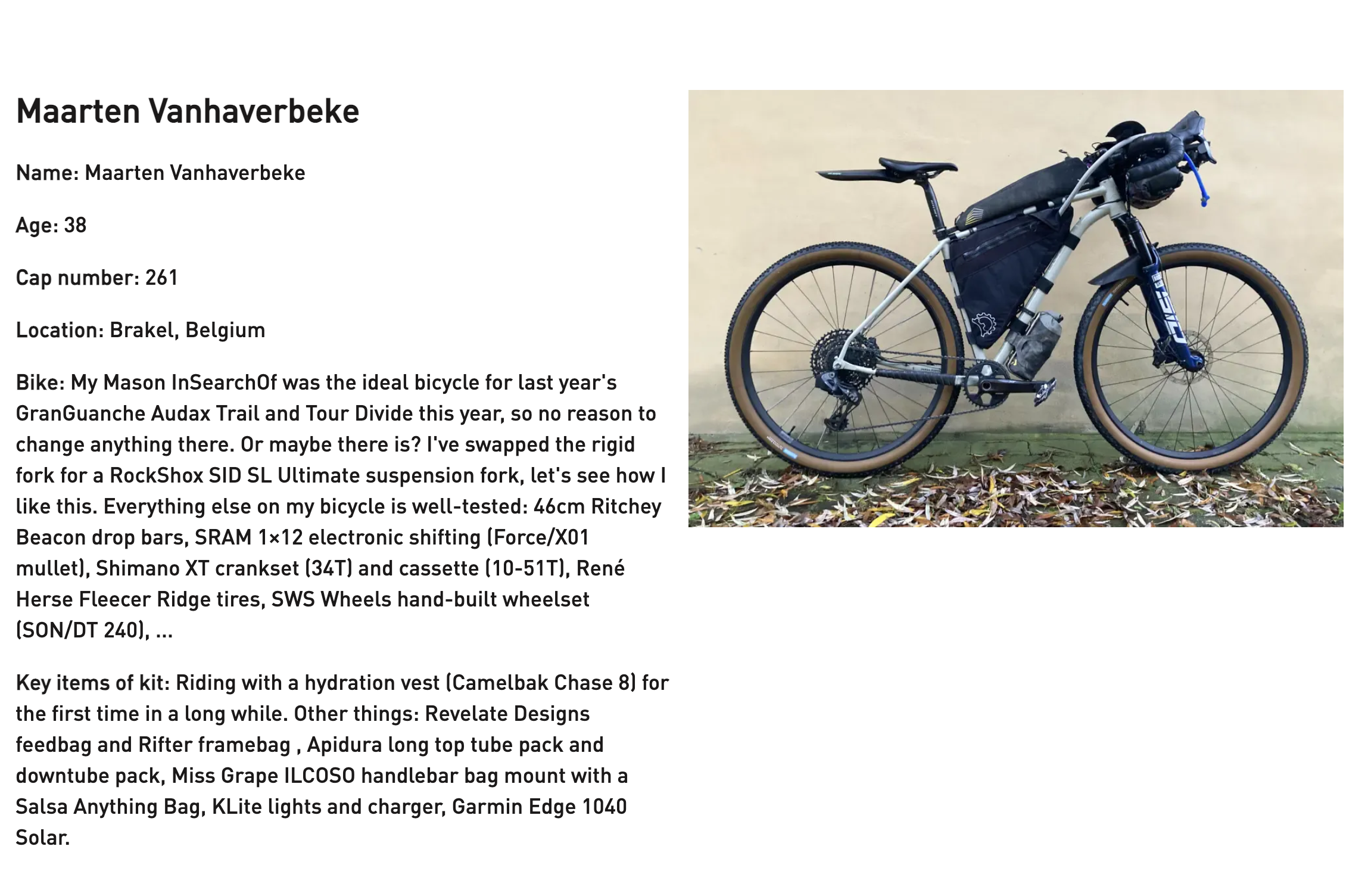 Before we dive into the insights, it’s important to understand the source of our data. The information is gathered from Rigs of and Bikes of sections. These are specific sections in Bikepacking.com and Dotwatcher.cc where where riders share details about their bikes and gear for races.