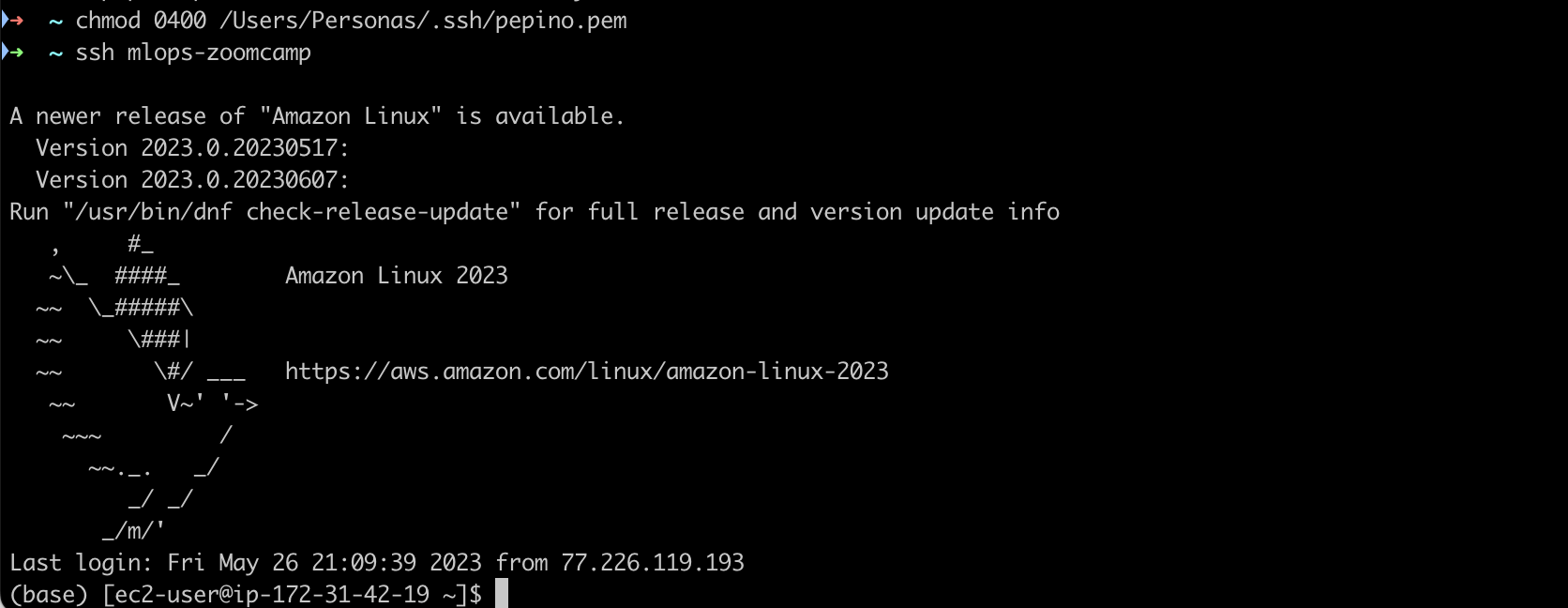 ssh -i ~/.ssh/<name of pem_file.pem> ec2-user@<public IPv4 address>
